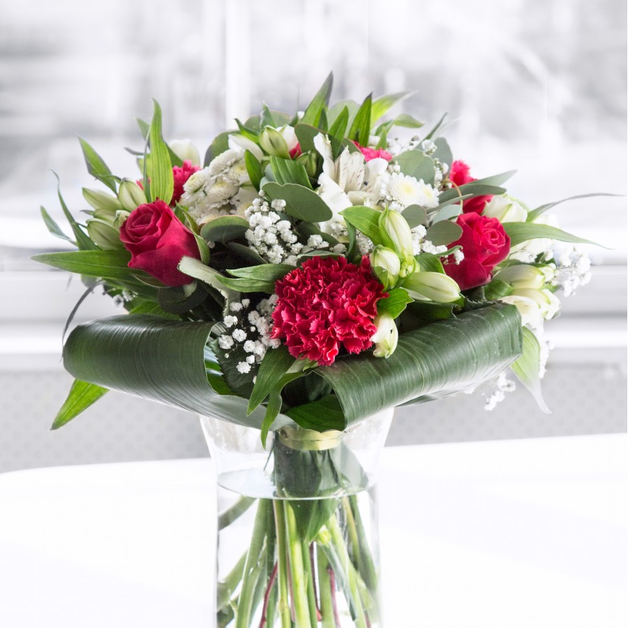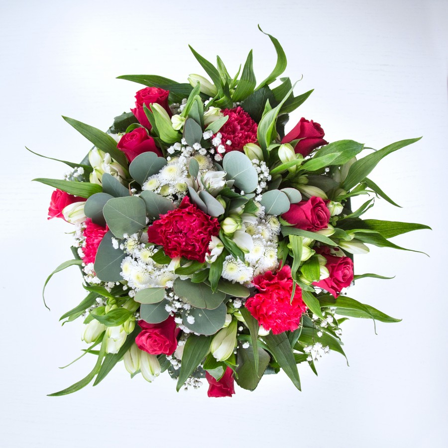 Celebrate special moments with our luxurious and unique flower bouquet. This stunning arrangement showcases sweet white chrysanthemums, delicate gypsophila, rich red roses, vibrant carnations, elegant white alstroemeria, and lush aspidistra leaves, all thoughtfully combined to create a mesmerizing display.