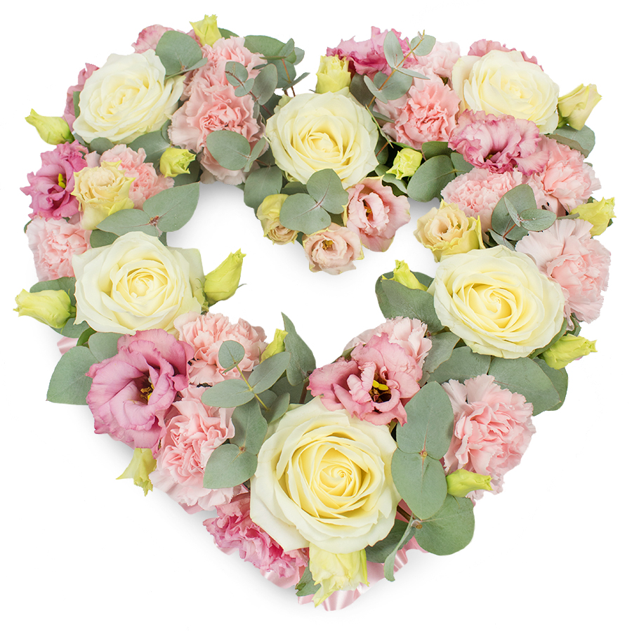Express your love and appreciation with our elegant heart-shaped tribute bouquet. This exquisite arrangement features white roses, pink carnations, pink lisianthus, and eucalyptus leaves, meticulously arranged to create a stunning and meaningful display.